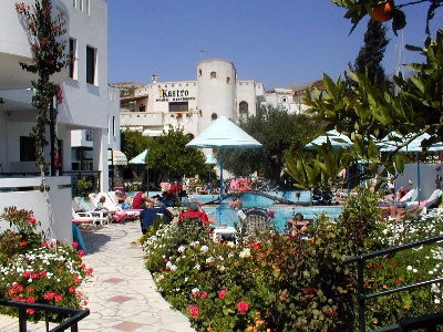 Nearby the local church on the road beside Myrtos, this large good standard property is set in beautiful garden, with lemon and orange trees. It has a swimming pool, poolside snack bar and a reception area. The beach and the village centre with its tavernas, shops and supermarkets is in a few minutes walking distance. The well maintained studios and apartments are furnished in traditional Cretan style, all beds have a fixed base, some of it are maisonettes. Kastro means castle in Greek, and the building is designed to match!